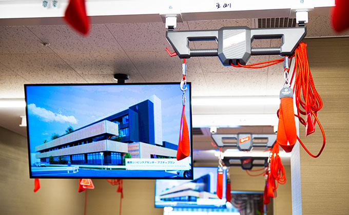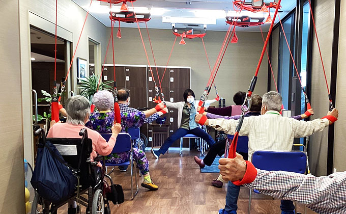 天井から吊るされたコードを使い、無理なく安全に体を動かせるため、楽しみながら健康づくりに取り組める人気の設備です。