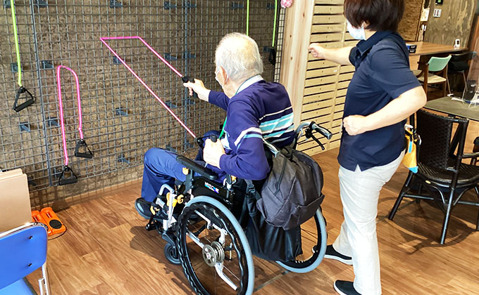 アイアンウォールでは、トレーニングゴムを引っ掛け、上腕や下肢でのばす筋力トレーニングを行っており、高い場所に洗濯ばさみの付け外しや移動させることで、バランス機能や関節可動域の訓練を行っています。