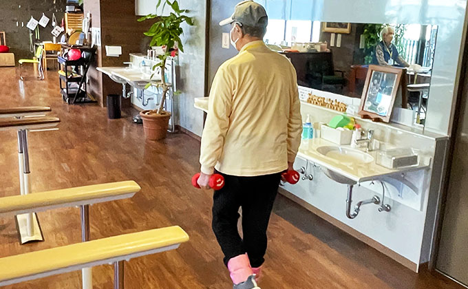 ご利用者は持久力UPと共に、手首や足首に錘をまいて筋力UPを目指した歩行や、ウォーターバッグを抱えた歩行でバランス機能の向上を目的とし歩行訓練を行っています。