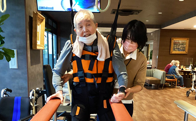 天井に設置されたレールとハーネスを使用して身体を支える事で転倒の心配なく安心して歩行練習を行う事が出来ます。ご利用者一人ひとりの体力や状態に合わせて、専門スタッフが丁寧にサポートいたします。